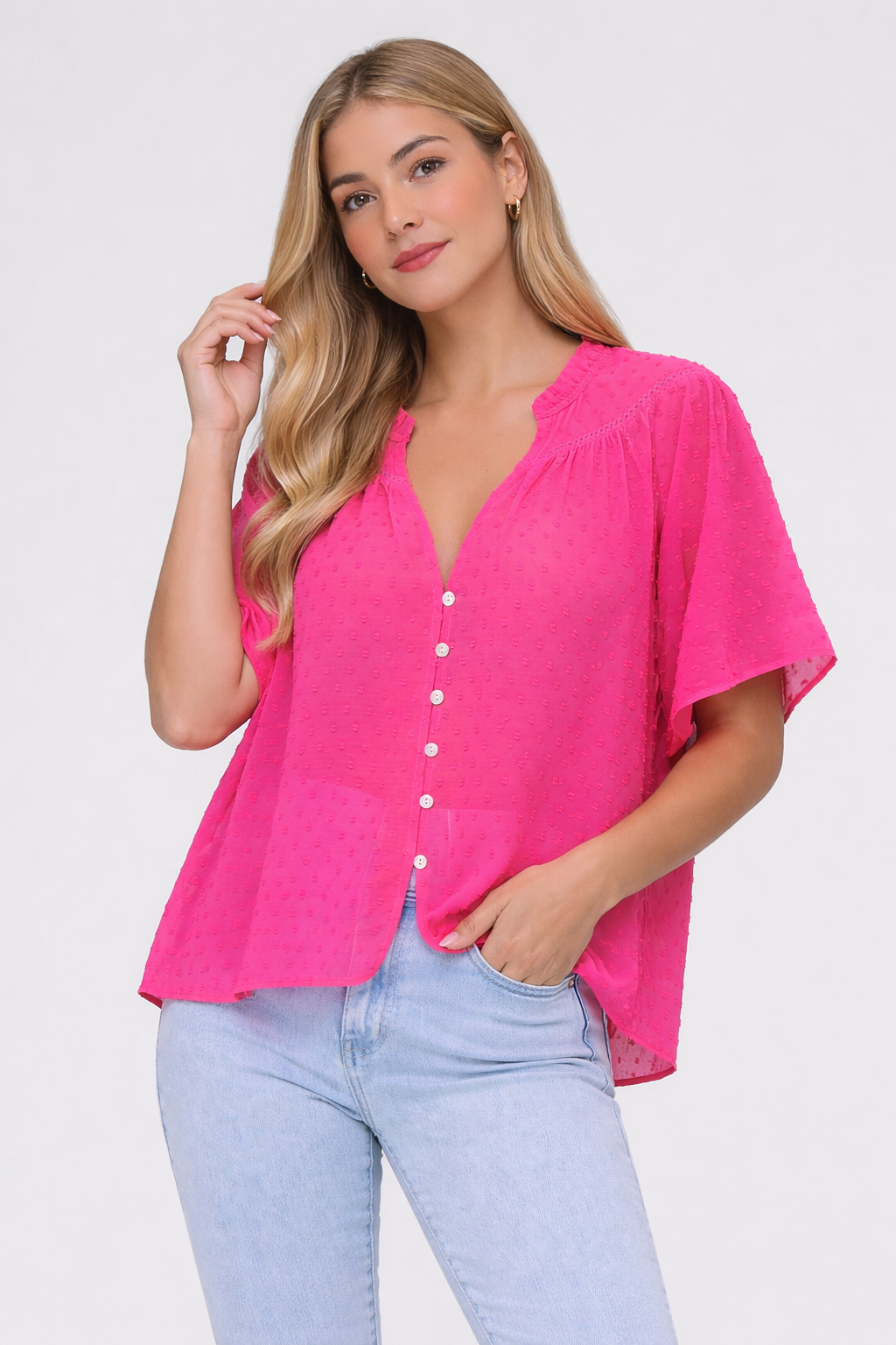 Flowy top in Swiss dot with lace detail, small ruffle in the neck, front closure, shell buttons, v neck.